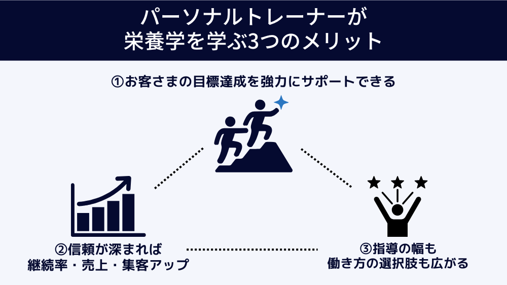 栄養学を学ぶことは、お客さまのためだけでなく、トレーナーとしてのキャリアそのものを、より豊かで安定したものへと変えるための自己投資でもあります。
